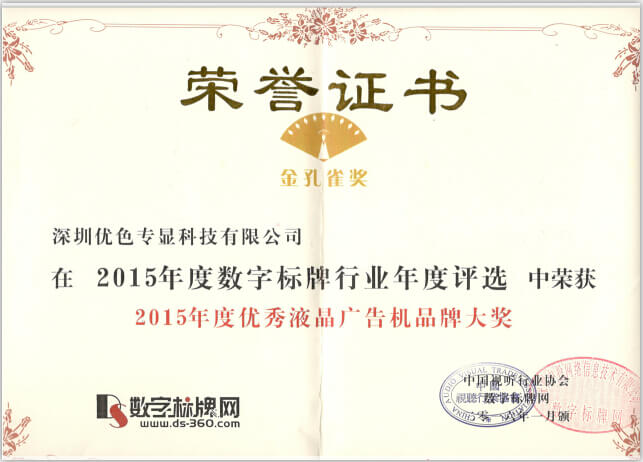深圳優(yōu)色專顯科技有限公司榮獲 “2015年度優(yōu)秀液晶廣告機(jī)品牌大獎(jiǎng)”