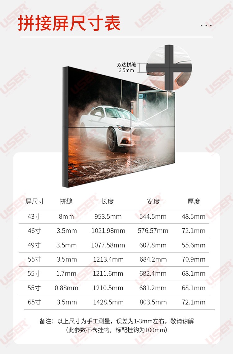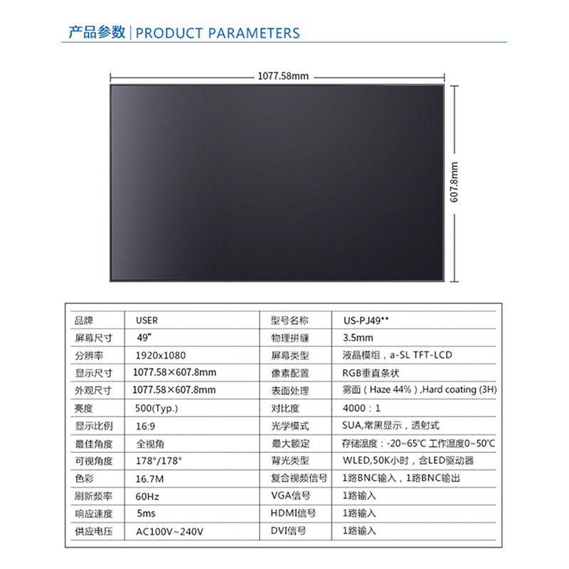 菜單產(chǎn)品中心Product center 液晶廣告機 壁掛式廣告機 落地立式廣告機 電梯超薄廣告機 車載廣告機 高亮廣告機 戶外廣告機 液晶拼接屏 專業(yè)液晶拼接屏 4K液晶拼接屏 廣告拼接屏 無縫液晶拼接屏 觸摸液晶拼接屏 LED顯示屏 觸控一體機 壁掛式觸控一體機 立式觸控一體機 斜面觸控一體機 智能家居觸控一體機 戶外觸控一體機 液晶電子白板 教育電子白板 會議電子白板 工控一體機 觸摸顯示器 紅外觸摸顯示器 電容觸摸顯示器 電阻觸摸顯示器 聲波觸摸顯示器 納米觸摸顯示器 液晶監(jiān)視器 專業(yè)級監(jiān)視器 4K監(jiān)視器 嵌入式監(jiān)視器 機架式監(jiān)視器 開放式監(jiān)視器 SDI監(jiān)視器 高亮監(jiān)視器 廣播級監(jiān)視器 工業(yè)顯示器 4K顯示器 機架式顯示器 開放式顯示器 醫(yī)療顯示器 KVM顯示器 指揮室顯示器 智慧校園產(chǎn)品 專業(yè)定制商顯 多屏廣告機 多功能觸控一體機 多功能廣告機 微信打印廣告機 魔鏡廣告機 透明廣告機 全息廣告機 條形屏廣告機 旋轉(zhuǎn)廣告機 裸眼3D廣告機 人工智能產(chǎn)品 顯示配套設(shè)備 拼接配套設(shè)備 廣告機播放盒 OPS播放盒 拼接支架 移動支架 相關(guān)軟件 吊頂支架 線材 木架 蜂窩箱 桌面底座 熱門產(chǎn)品 →優(yōu)色3.5mm超窄邊46寸液晶拼接屏→優(yōu)色49寸3.5mm超窄邊液晶拼接屏→優(yōu)色3.5mm超窄邊55寸液晶拼接屏 您的位置:首頁 → 公司產(chǎn)品 → 液晶拼接屏 → 專業(yè)液晶拼接屏 優(yōu)色49寸3.5mm超窄邊液晶拼接屏類別:專業(yè)液晶拼接屏 簡介:◆ 型號:US-PJ49** ◆類型:三星/LG/京東方BOE面板 ◆亮度:500-700cd/m2(可選) ◆超窄邊設(shè)計,拼縫3.5mm ◆ 在ISO9001嚴格的質(zhì)量控制體系下生產(chǎn)? ◆ 色彩均勻,圖像穩(wěn)定,為拼接大畫面定制... 在線咨詢 返回列表 產(chǎn)品說明 相關(guān)產(chǎn)品 優(yōu)色1.7mm超窄邊55寸液晶拼接屏 優(yōu)色49寸1.8mm超窄邊液晶拼接墻 優(yōu)色49寸3.5mm超窄邊液晶拼接屏 優(yōu)色3.5mm超窄邊55寸液晶拼接屏 優(yōu)色3.5mm超窄邊46寸液晶拼接屏 優(yōu)色5.3mm超窄邊55寸液晶拼接屏
